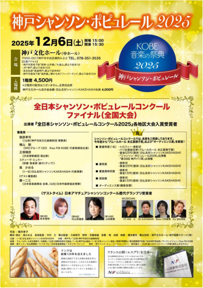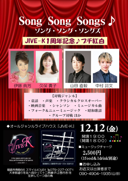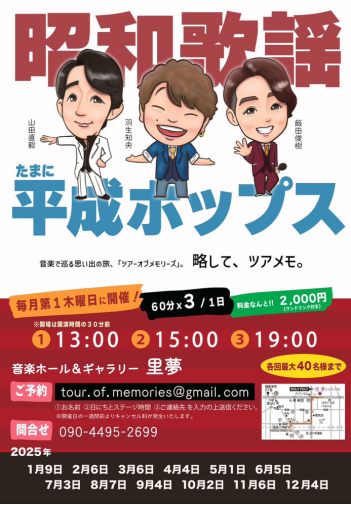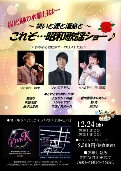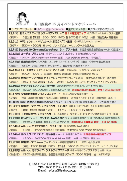 CONCERT & EVENT SCHEDULE 【下記のイベントに関するご予約・お問い合わせ】 mailto:eforte3@yahoo.co.jp 山田まで♪ ~ 2025年のピックアップイベント ~ ◆ヴァイオリン&ヴォーカルデュオ 50♪50 ★ヴォーカルデュオ『BLENDY』 ☆主にピアニストでの出演 <毎月の定期ライブ・イベント> ◆第1木曜日:神戸/六甲 [ツアー・オブ・メモリーズ男性歌手3名の昭和歌謡ライブ] @音楽ホール&ギャラリー里夢 ◆第3火曜日:加古川 [山田直毅ピアノサロン] @with you(お客様歌唱のステージ) ◆第3木曜日:姫路[ピアノ弾き語りライブ] @YSカフェレストラン&スペース 姫路市岡田624-9 TEL 090-6026-1749 ◆第4月曜日:姫路[ヒヨシまる・NAOKIサロン] @ヒヨシまる(旧伊勢田薬品)※お客様歌唱のステージ 姫路市本町68イーグレ姫路の南西(本町商店内) ◆毎月最終水曜日:姫路「これぞ昭和歌謡ショー」 @オールジャンルライブハウス『JIVE-K』 姫路市南町66 ℡ 079-227-0071 ~ 2025年12月以降のピックアップイベント ~