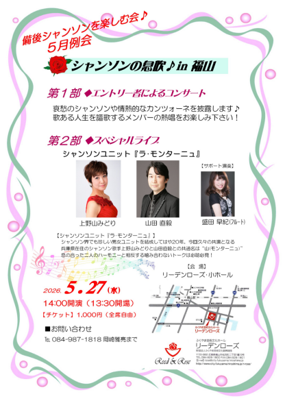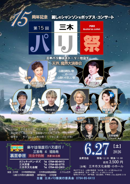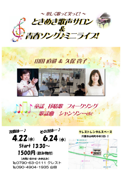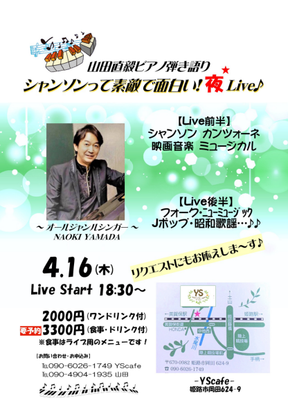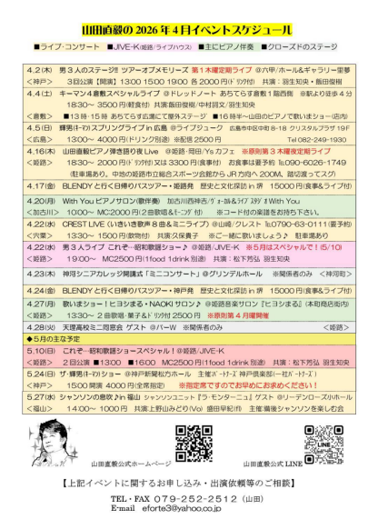 CONCERT & EVENT SCHEDULE 【下記のイベントに関するご予約・お問い合わせ】 mailto:eforte3@yahoo.co.jp 山田まで♪ ~ 2026年のピックアップイベント ~ ◆ヴァイオリン&ヴォーカルデュオ 50♪50 ★ヴォーカルデュオ『BLENDY』 ☆主にピアニストでの出演 <毎月の定期ライブ・イベント> ◆第1木曜日:神戸/六甲 [ツアー・オブ・メモリーズ男性歌手3名の昭和歌謡ライブ] @音楽ホール&ギャラリー里夢 ◆第3火曜日:加古川 [山田直毅ピアノサロン] @with you(お客様歌唱のステージ) ◆第3木曜日:姫路[ピアノ弾き語りライブ] @YSカフェレストラン&スペース 姫路市岡田624-9 TEL 090-6026-1749 ◆第4月曜日:姫路[ヒヨシまる・NAOKIサロン] @ヒヨシまる(旧伊勢田薬品)※お客様歌唱のステージ 姫路市本町68イーグレ姫路の南西(本町商店内) ◆毎月最終水曜日:姫路「これぞ昭和歌謡ショー」 @オールジャンルライブハウス『JIVE-K』 姫路市南町66 ℡ 079-227-0071 ~ 2026年4月以降のピックアップイベント ~